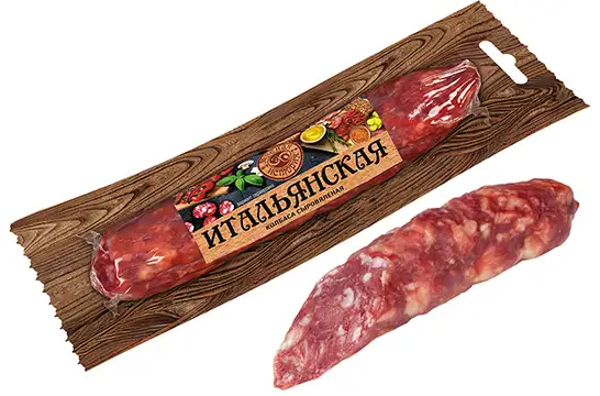Состав: свинина, нитритно-посолочная смесь (соль, фиксатор окраски (нитрит натрия)), декстроза, клетчатка растительная, усилитель вкуса и аромата (глутамат натрия), антиокислитель (аскорбат натрия), специи (мацис, перец, чеснок, тмин, розмарин, сельдерей, лук), экстракт паприки, ароматизаторы, сироп глюкозы, лактоза, экстракт дрожжей, краситель (кармины), стартовая культура.