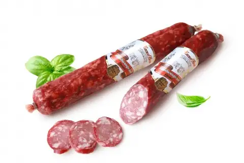 Срок годности: 3 месяца Состав: мясная обрезь, диофрагма свиная, свинина, соль йодированная, экстракты специй и пряностей (черный перец, кориандр, сельдерей, острый перец, пажитник). Пищевая ценность на 100 граммов продукта (среднее значение): белки — 20,9 г; жиры — 57,3 г; энергетическая ценность — 2475 кДж (599 ккал)