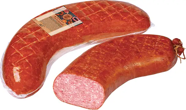 Состав: свинина, шпик, белок животный говяжий, вода питьевая, молоко сухое, нитритно-посолочная смесь (соль, фиксатор окраски (нитрит натрия)), стабилизатор (пирофосфат натрия), регулятор кислотности (трифосфат натрия), декстроза, усилитель вкуса и аромата (глутамат натрия), антиокислитель (изоаскорбат натрия), ароматизаторы, растительная клетчатка, краситель (кармин).