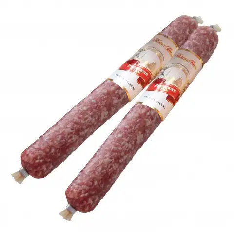 Срок годности: 3 месяца Состав: свинина, вода питьевая, шпик, белок соевый, соль йодированная, сахар, смесь натуральных экстрактов специй и пряностей (перец чёрный, орех мускатный, гвоздика). Возможно наличие компонентов яиц, глютена, сои, молока, горчицы, сельдерея, кунжута и продуктов их переработки. Пищевая ценность на 100 г продукта (средние значения): белки — 22,5 г, жиры — 51,3 г. Энергетическая ценность — 552 ккал/2281 кДж.