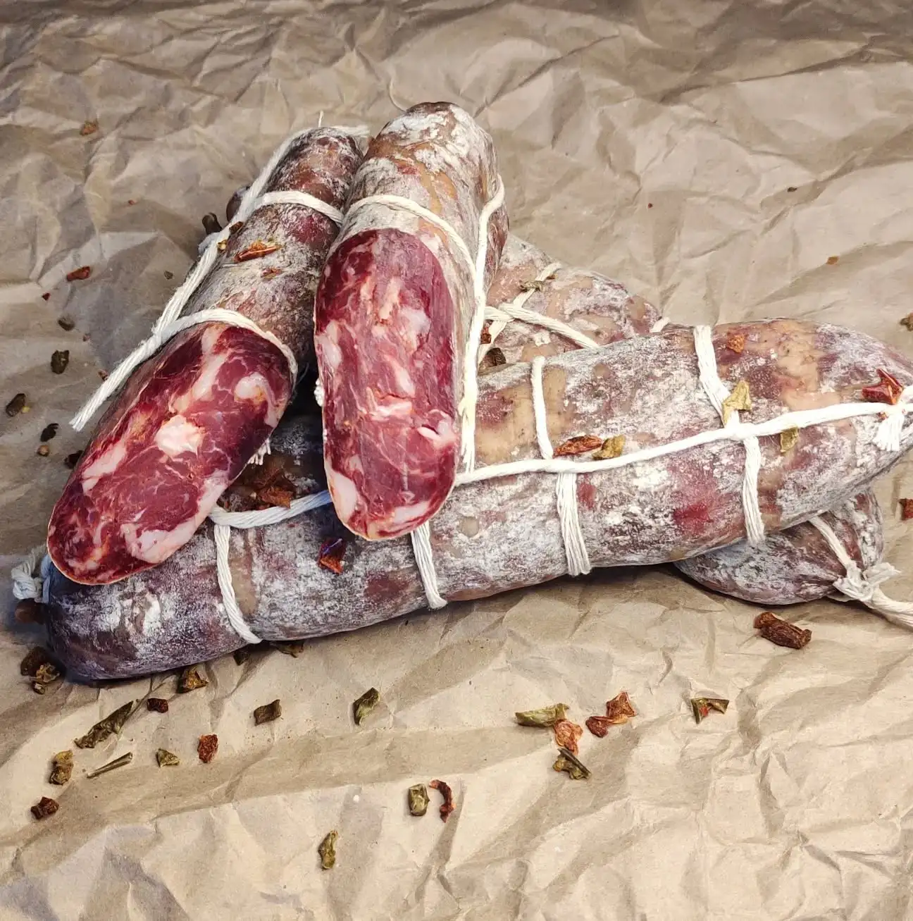 Колбаса сыровяленая из свиной шеи. По оригинальной рецептуре с Полесья Беларуси с ярко выраженным остро-пряным вкусом и ароматом тмина, кумина и перцев