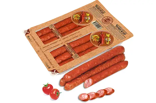 Состав: свинина, шпик свиной, вода питьевая, свиной коллагеновый белок, нитритно-посолочная смесь (соль, фиксатор окраски (нитрит натрия)), регуляторы кислотности (трифосфаты, цитраты натрия), усилитель вкуса и аромата (глутамат натрия), пряности и их экстракты (перец белый, кориандр, чеснок, перец черный), антиокислитель (аскорбат натрия), сахар, краситель (кармины).
