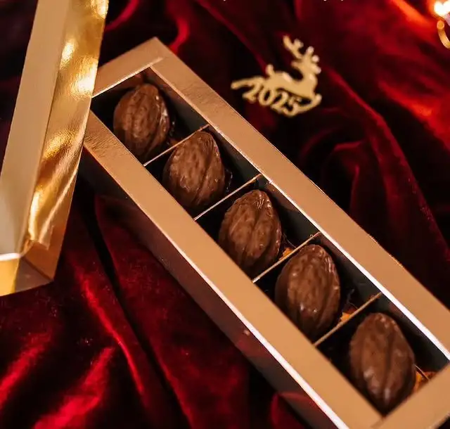 Конфеты из итальянского премиального молочного шоколада. Внутри сливочная солёная карамель и пекан.