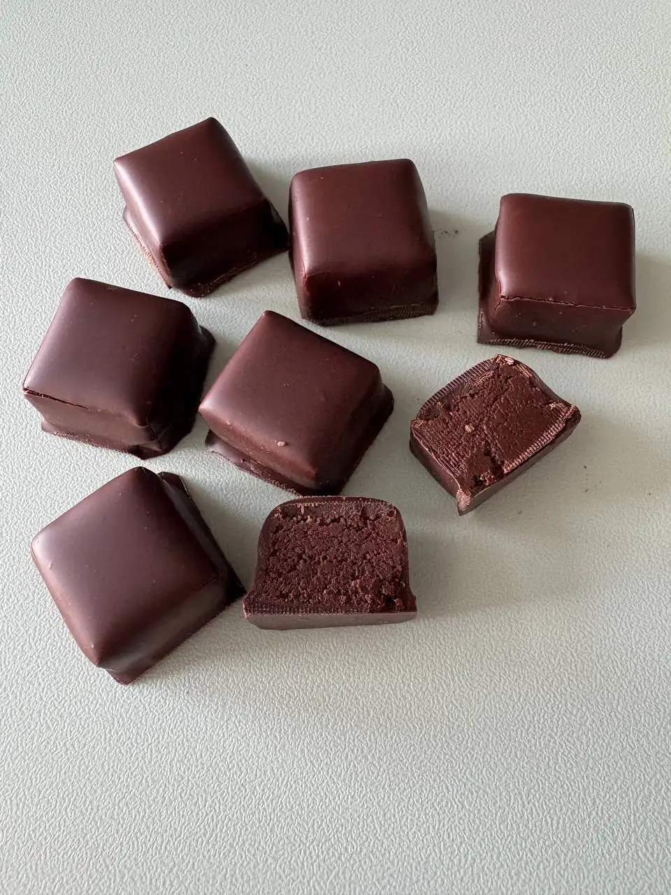 Рамесныя цукеркі з начынкай праліне. Натуральны склад. Араматычныя гатункі какава-бабоў, нерафінаваны трысняговы цукар, какава-алей, фундук, сухое малако. Нічога лішняга. Зроблены з клопатам аб вашым здароўі. Просты склад, але цудоўны смак.