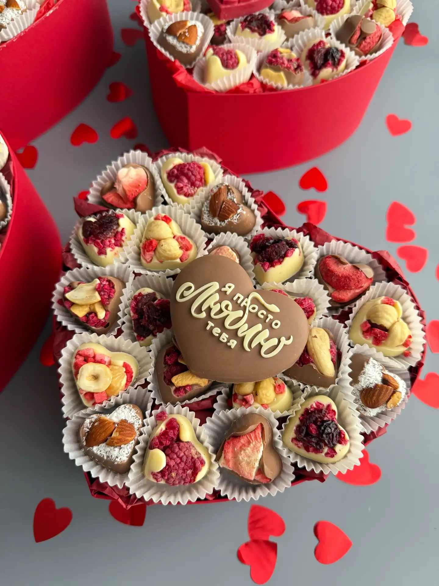 Внутри сердечки из белого и молочного шоколада, с орехами и сублимированными ягодами. Невероятное сочетание вкуса
