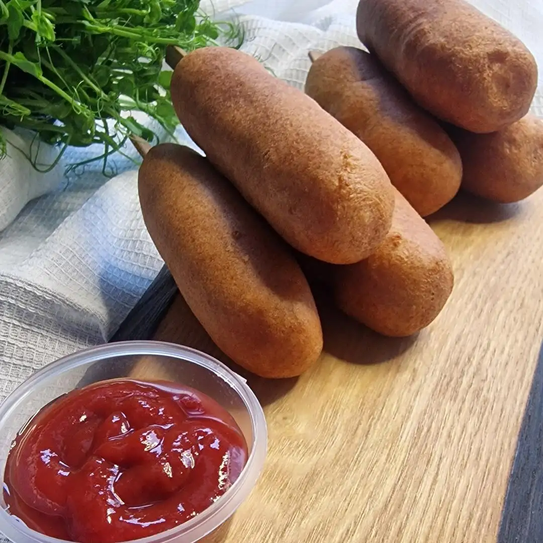 Заказ от 5 шт. Состав: мука кукурузная, мука пшеничная, яйцо, молоко, соль, сахар, разрыхлитель, сосиски, масло растительное, кетчуп.