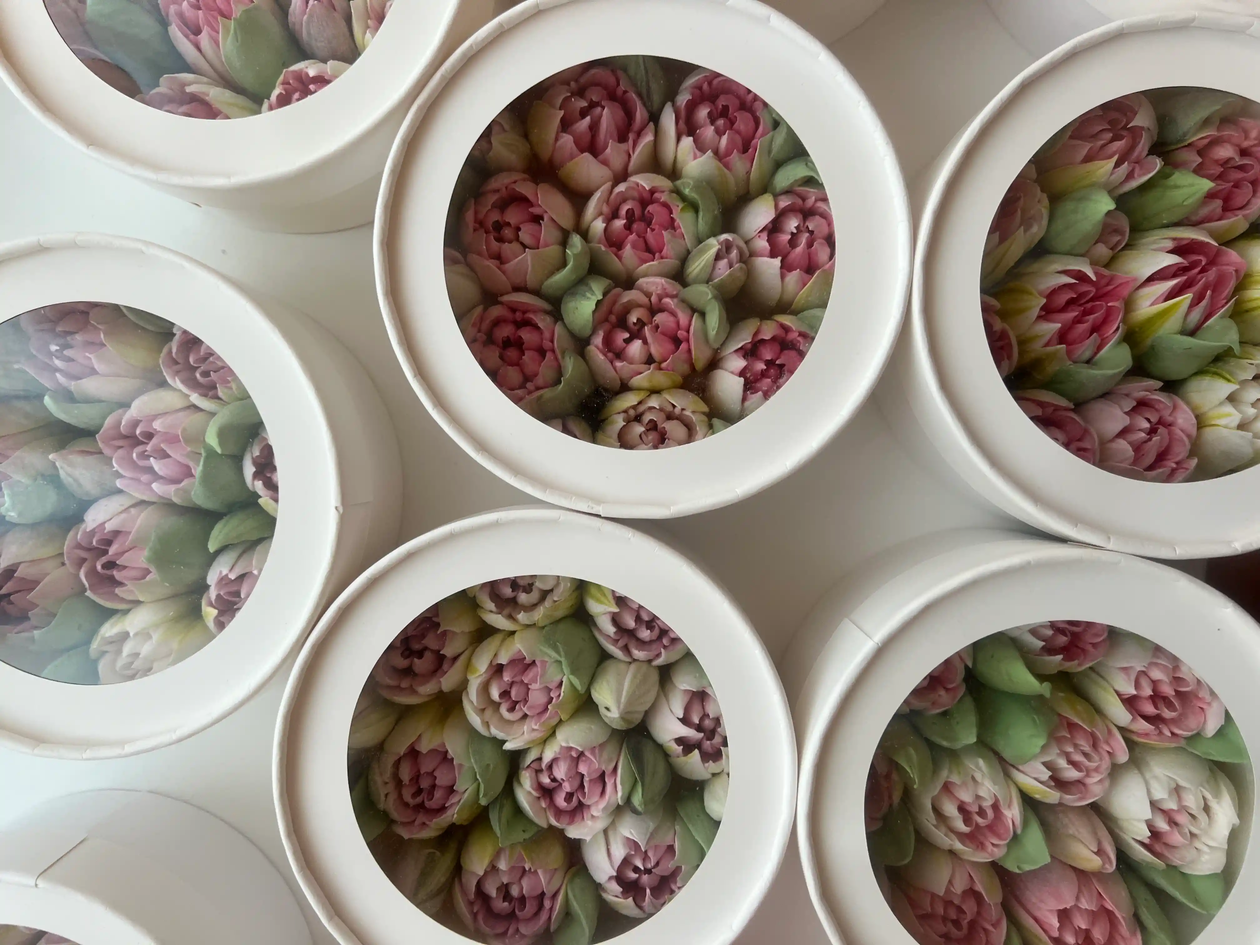 Состав зефирных цветов: Пюре яблочное, сок яблочный или фруктовый, Сахар, инвертный сироп, белки, агар-агар, ванилин. Количество цветов может отличаться в зависимости от насадки. Оттенок тюльпанов можно выбрать любой , по договоренности.