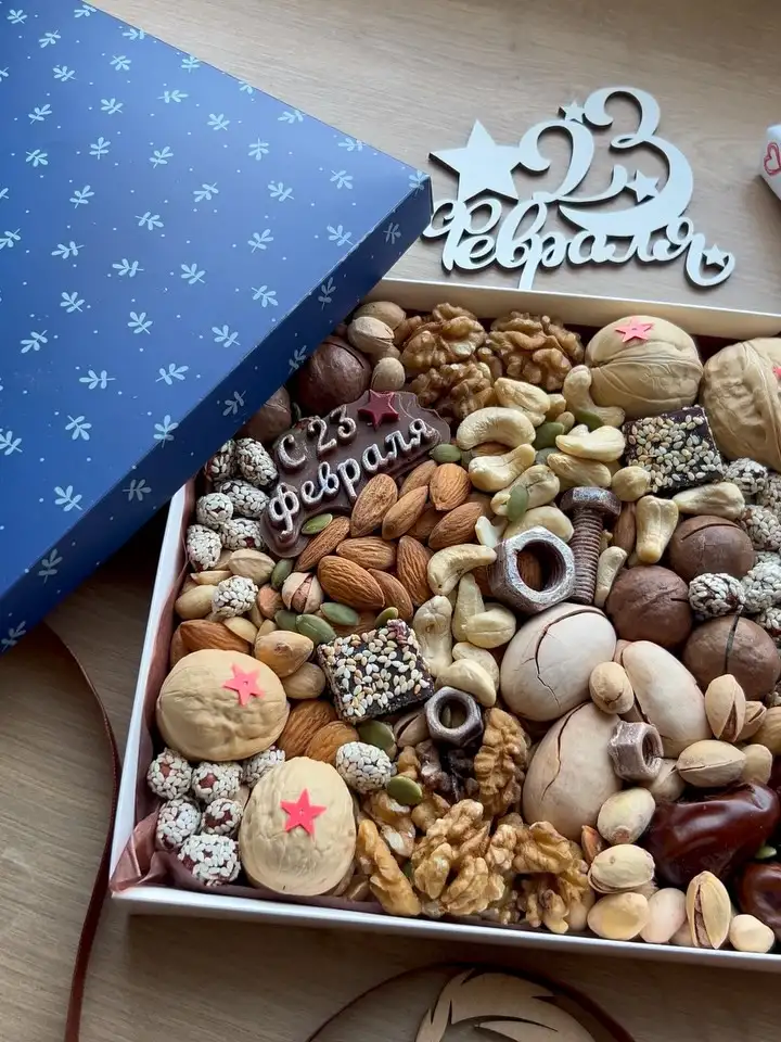 Размер 20/20 см Вес 600 г Состав: грецкий орех, макадамия, пекан, миндаль, кешью, арахис, арахис в кунжуте, рахат-лукум, финики, шоколадные фигурки, тыквенные семечки