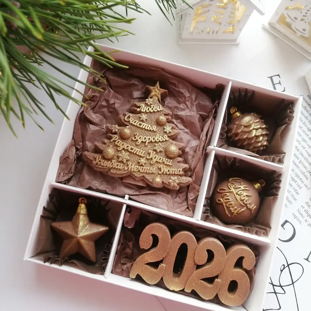Вся новогодняя атрибутика из вкуснейшего премиального молочного шоколада с добавлением орехов, воздушного риса, цукатов и сублимированных ягод.