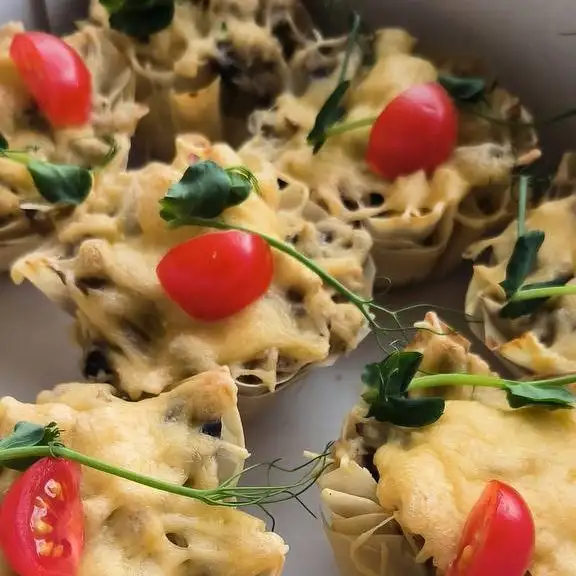 Сост10ав: тесто фило, шампиньоны, лук, куриное филе, сыр.