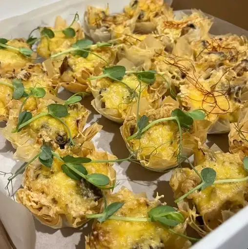 Бокс корзиночек из тесто фило: — 10 штук с курицей, грибами, сливками, луком и сыром, украшение микрозелень — 10 штук с кальмаром, грибами, сливками, луком и сыром Вес бокса 1000 гр