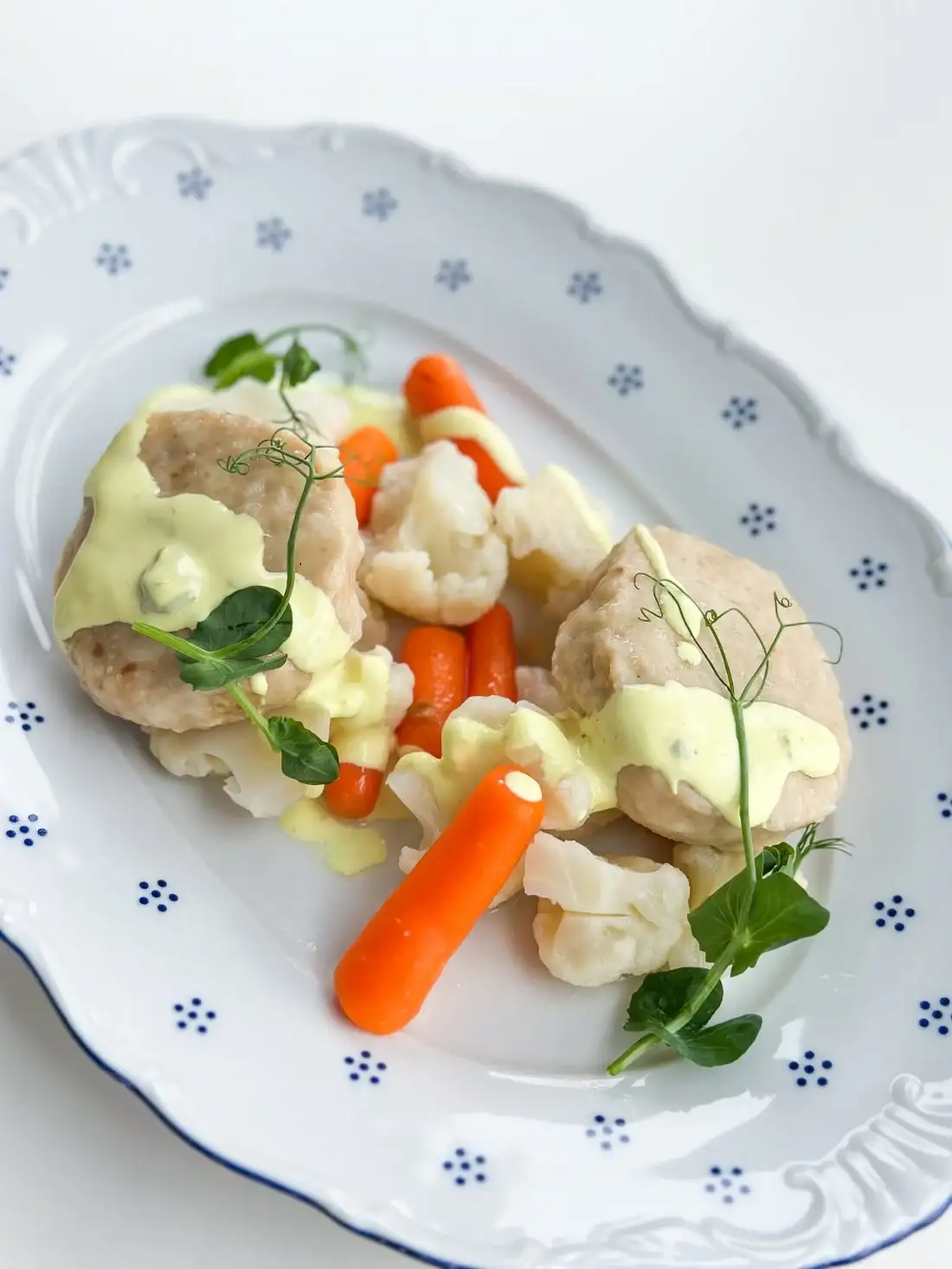 филе хека, шпик, хлеб пшеничный, яйцо куриное, соль, перец черный молотый. Пищевая ценность на 100 гр продукта (среднее значение): к/б/ж/у — 134/13,47/6,09/5,93