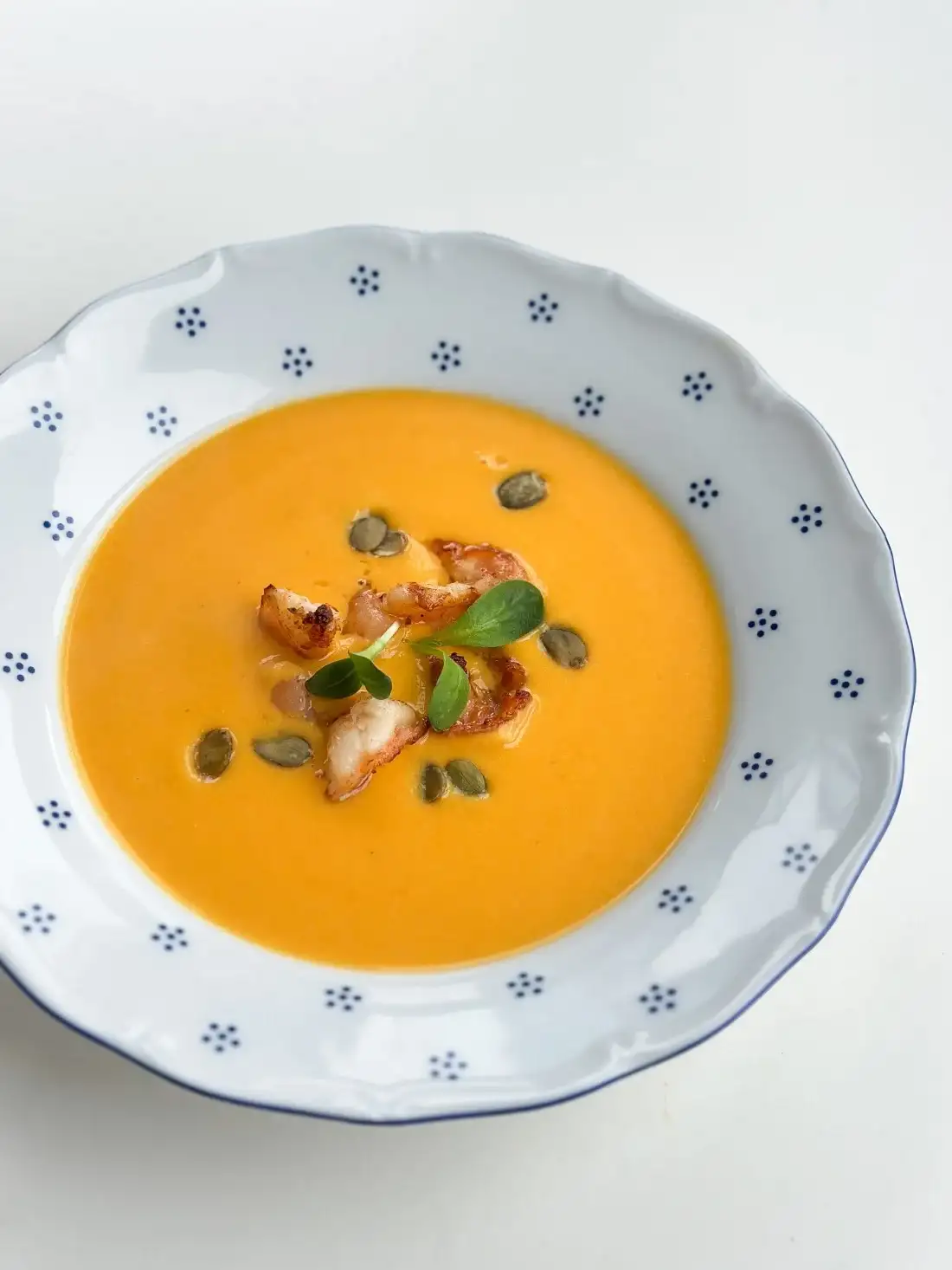 Состав: Тыква, картофель, морковь, лук репчатый, сливки 20%, кокосовое молоко, масло растительное, чеснок, креветка, крем-чиз, соль.