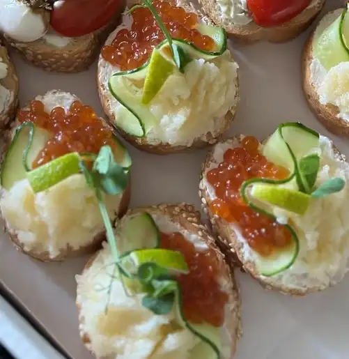 На выбор: — Кростини с икрой (2 вида) и свежим огурцом — Кростини с муссом из сыра с голубой плесенью и виноградом — Кростини с жареным беконом, зеленью и каперсами — Кростини с салями и черри Заказ от 10 штучек.