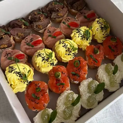 Кростини с говядиной Кростини с полендвицей Кростини с форелью Кростини с сырно-яичным паштетом Кростини с сезонной ягодой 1000 гр