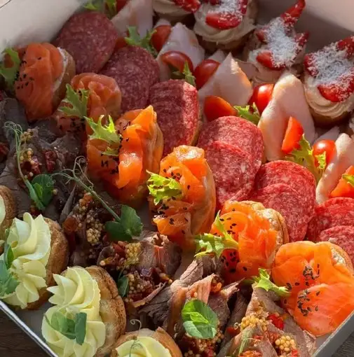 Кростини с сырно- яичным муссом Кростини с говядиной Кростини с форелью Кростини с салями Кростини с карбонатом Кростини с сладким кремом и ягодами