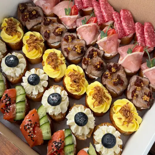 • кростини с сезонной ягодой (6 шт) • кростини с карбонадом и черри (6 шт) • кростини с салями (6 шт) • кростини с форелью (6 шт) • кростини с говядиной и вялеными томатами (6 шт) • кростини с сырно-яичным паштетом (6 шт)