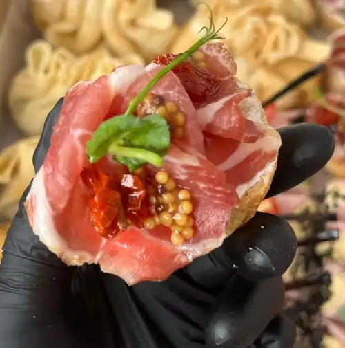 Багет, творожный сыр, буженина, вяленые томаты, французская горчица, микро зелень