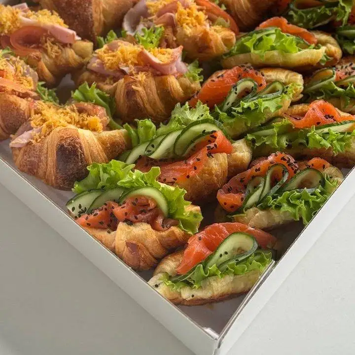 Выход 750 гр. Состав: круасаны, лосось, салат, яйцо, огурец, соус.