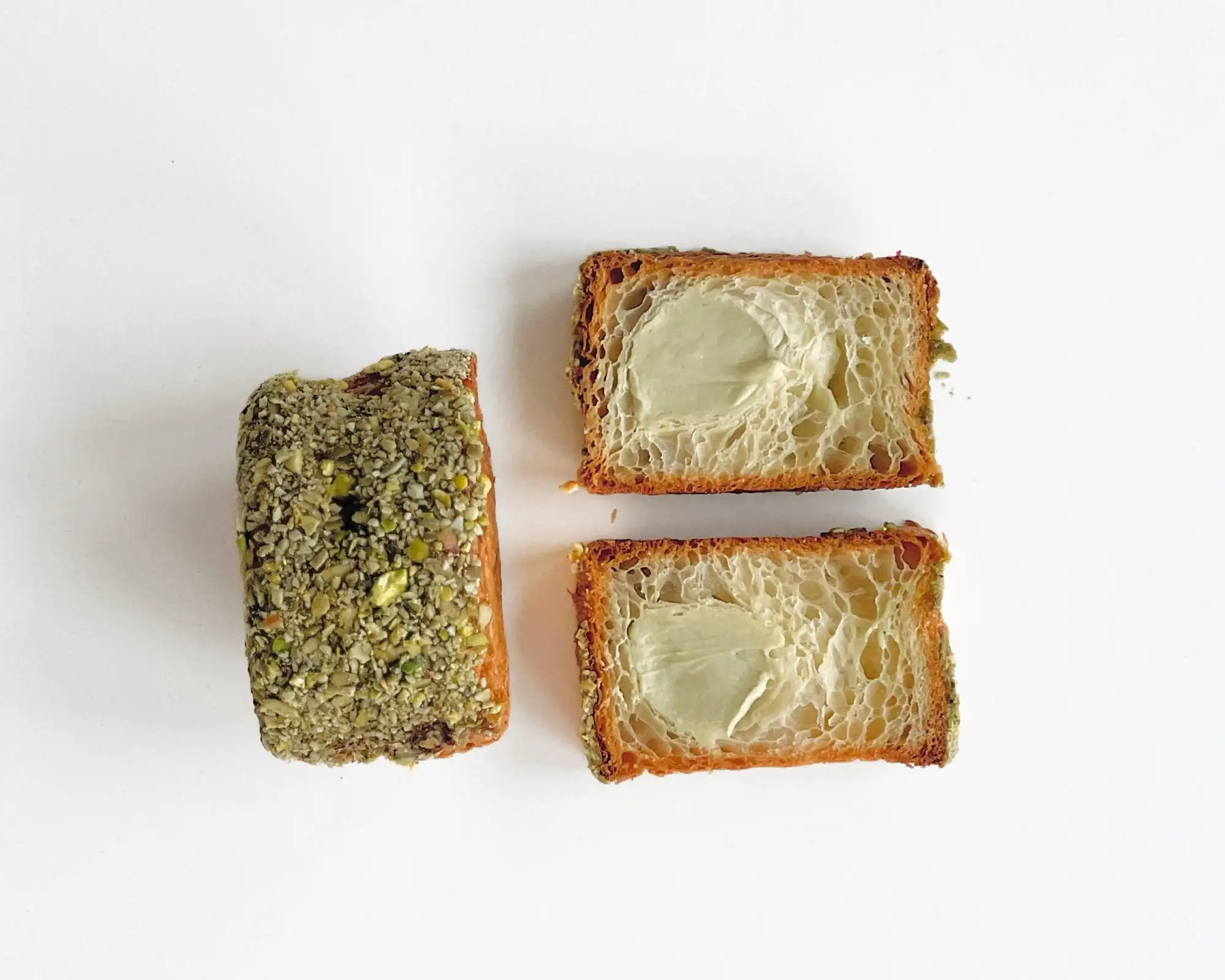 1 шт. — 150 г Слоёное тесто: мука пшеничная в/с дрожжи прессованные молоко 3,2% сахар-песок соль масло сливочное 84% мука белок (для сл.теста) вода Крем фундучный заварной п/ф: сахар-песок крахмал кукурузный молоко 3,2% масло сливочное 82,5% яйцо куриное (желток) сливки 33% желатин пищевой паста фисташковая п/ф Семена тыквы