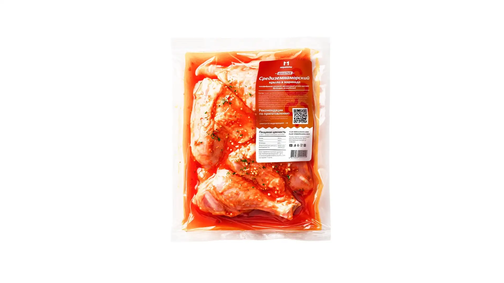 Состав: крыло цыпленка-бройлера, вода питьевая, масло растительное, комплексная пищевая добавка (соль, пряности (сладкий перец, белый перец, чеснок, горчица, тмин, имбирь), сушеные овощи, стабилизатор Е1422, усилитель вкуса и аромата Е621, сахар, загуститель Е412, экстракты пряностей (сладкий перец, чеснок), комплексная пищевая добавка (консервант Е262i, соль, стабилизатор Е331ii, антиокислители: Е301, Е300), комплексная пищевая добавка (консерванты Е262i ацетат натрия / Е262ii диацетат натрия, соль). Содержит аллерген: горчица. Характеристики: Жиры — 14 г Белки — 16 г Углеводы — 0,5 г Срок годности — 30 суток Энергетическая ценность (калорийность) — 810,0 кДж/190,0 ккал