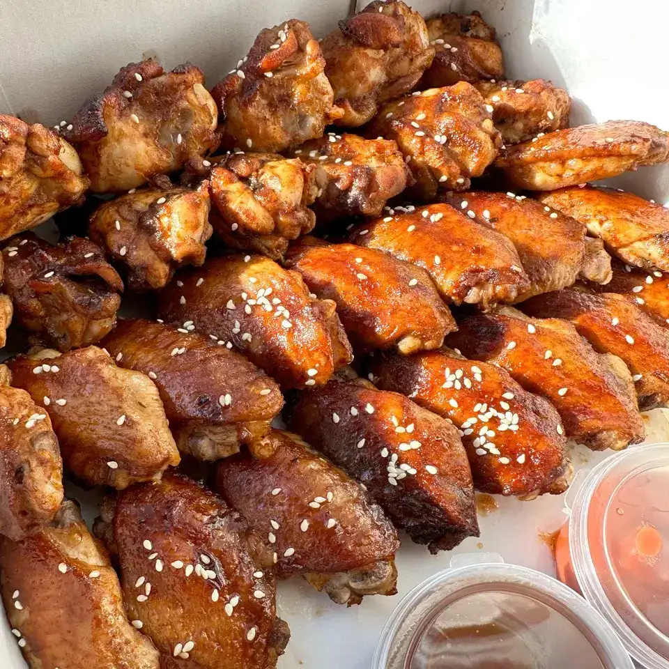 Крылышки, запеченные под соусом терияки, в набор входят соусы. Отлично подойдет для компании из 6 человек!