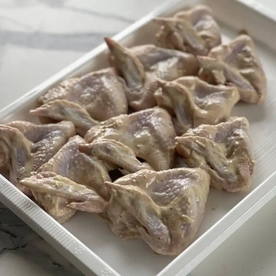Крылышки в горчичном маринаде (крылья кур, майонез, горчица столовая, чеснок, сок лимона, соль, перец).