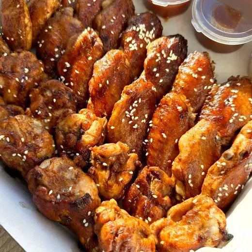 Куриные крылья запеченные в соусе терияки . Соусы: -Кисло-сладкий -Пикантный бургерный -Сырный -Кетчуп