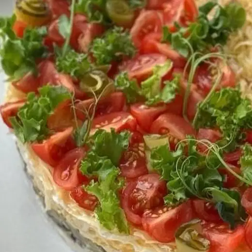 Куриный салат с грибами и помидорками черри — это красивое и вкусное блюдо, которое можно подать на праздничный стол. Салат выкладывается слоями.