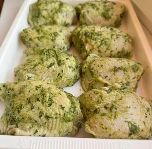 Куриное бедро, соль, специи, зелень (укроп, петрушка), чеснок, уксус 9%