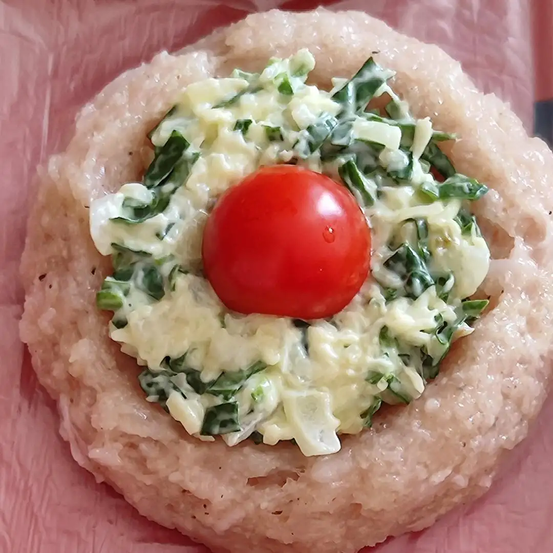 Куриные гнезда (фарш куриный, сухари панировочные, яйца куриные, соль, перец, сыр твердый, лук репчатый, майонез, шпинат, помидор черри). Цена указана за полуфабрикат*