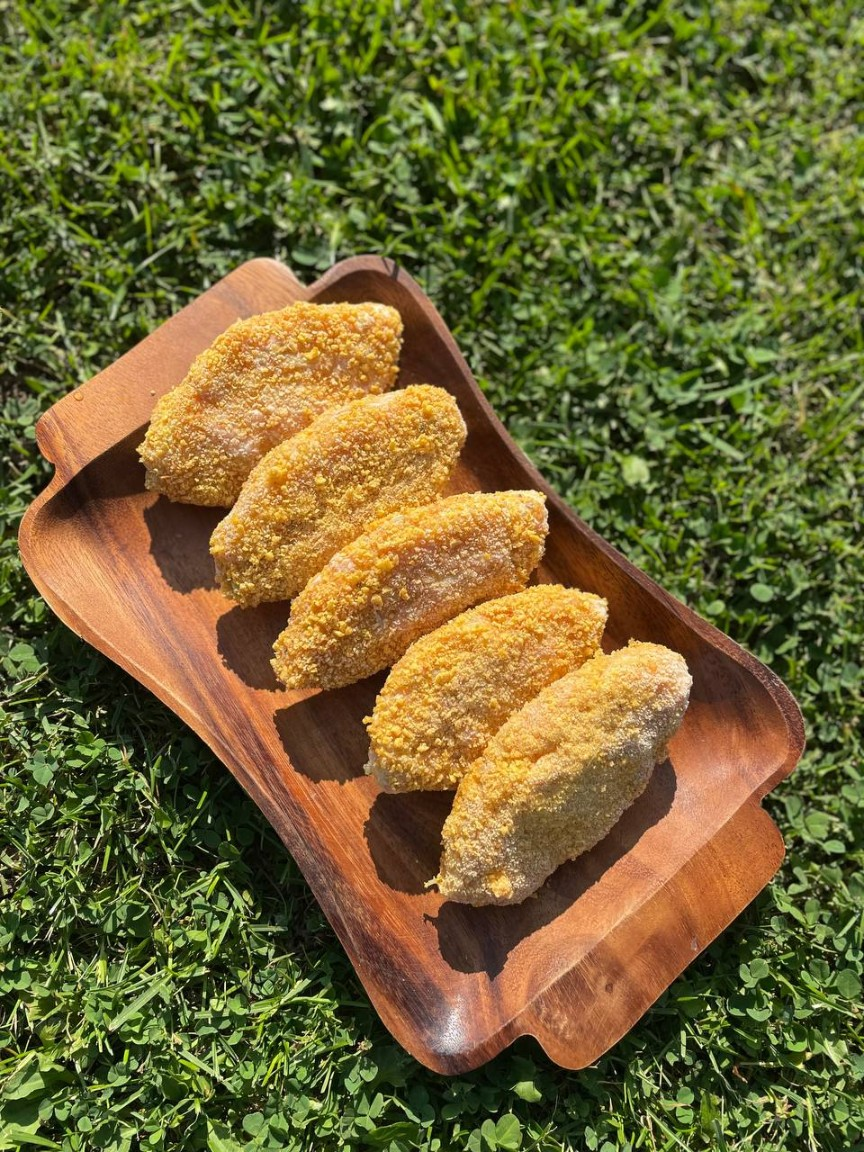 Состав: самодельный фарш из куриного филе, кабачок, сыр сулугуни, кукурузная панировка Требует термической обработки