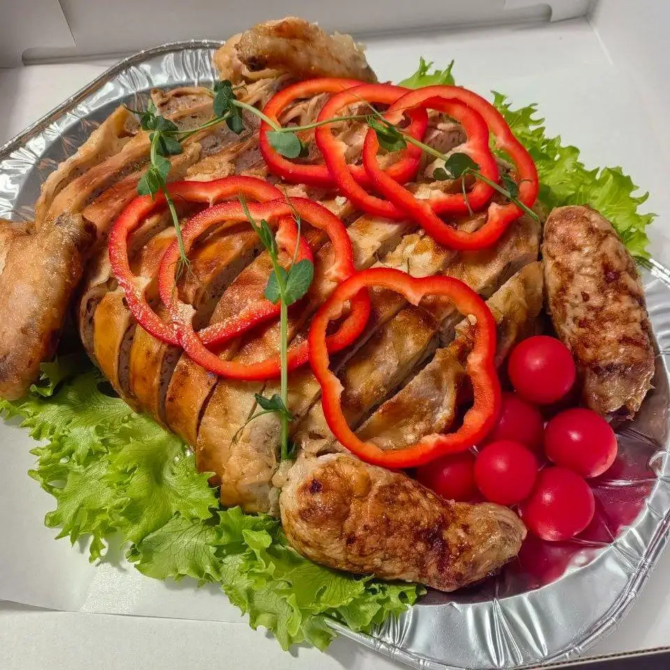 Тушка выходит до 2-х кг Начинка: блины, мясо курицы, шампиньоны, сыр, лук