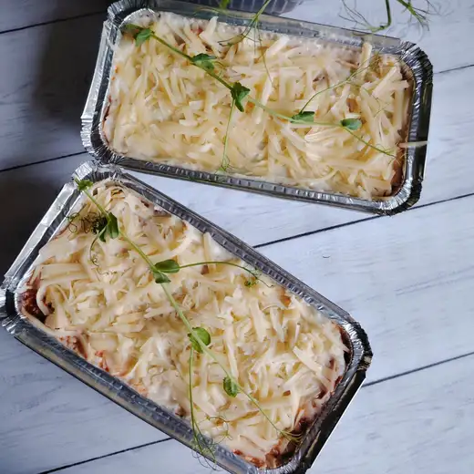 Листы для Лазаньи, фарш свинина, лук, томатный соус, белый соус, сыр, специи, соль.