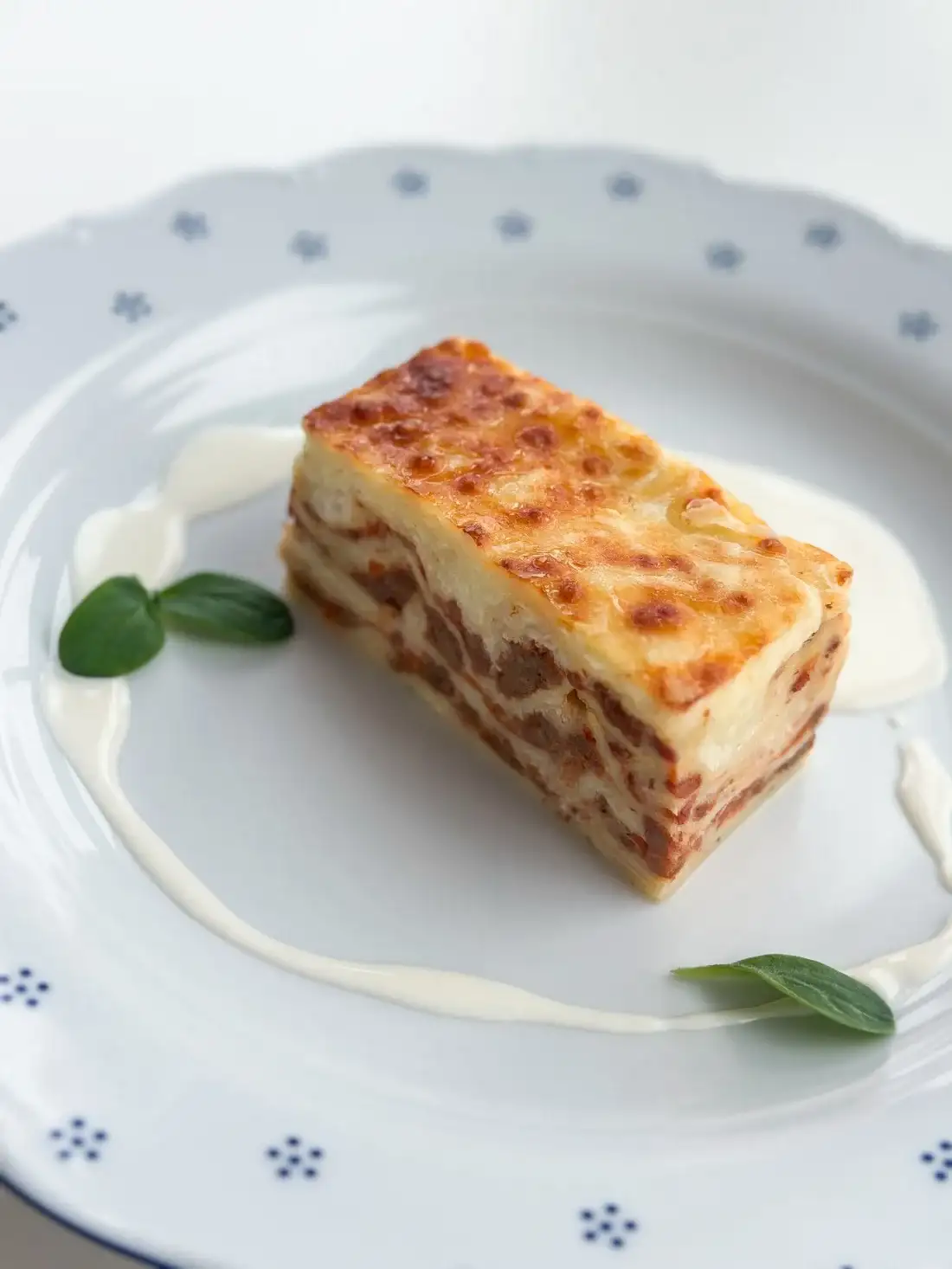 Макаронные изделия лазанья группа А в/с, мука, говядина, свинина, молоко, томаты, сыр грана падано, сливки, сливочное масло, лук, морковь, вино кр.сух, томатная паста, чеснок, соль, сахар, перец черный.