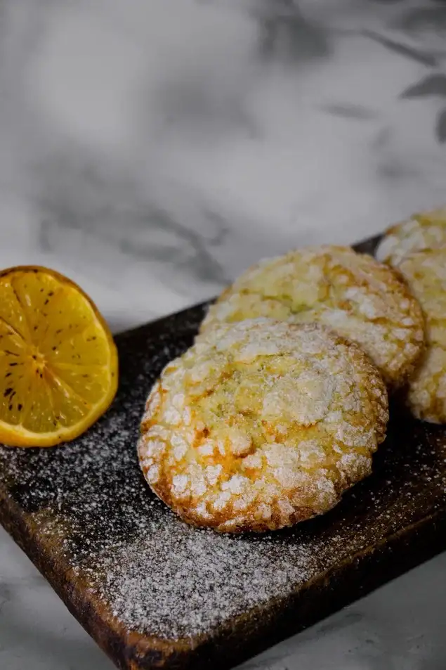 Печенье на основе лимонного сока, цедры и сливочного масла, сверху покрыто сахарной пудрой с добавлением ванили.