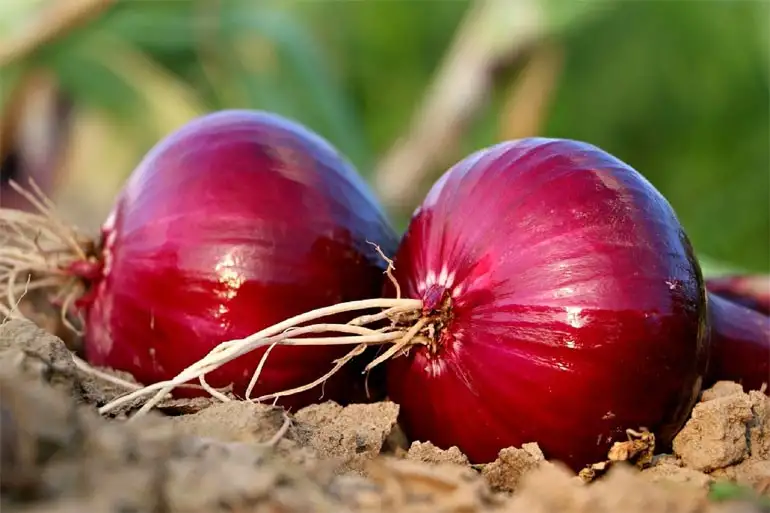 Лук красный содержит в своем составе большую концентрацию полезных минералов и витаминов, например таких, как: витамины группы В (В1, В2, В5, В6), витамины А и витамин С, витамин Р. Так же в красном луке много магния, железа, йода, кобальта, меди, цинка и калия. Красный цвет лука обусловлен наличия в нем большого количества веществ-антоцианов, которые в свою очередь помогают нашему организму избавляться от шлаков, таксонов и свободных радикалов. Так же эти вещества увеличивают защитные силы организма, помогают бороться с воспалениями, болезнетворными бактериями и инфекциями, замедляют разрушение клеток, предупреждают возникновение злокачественных образований. Несмотря на все положительные характеристики, красный лук не рекомендовано употреблять в пищу людям с почечной недостаточностью и проблемами желудочно-кишечного тракта. В кулинарии красный лук нашел свое широкое применение практически во всем. От декора, до полноценного самостоятельного ингредиента (а иногда и основного) в салатах, закусках, супах, соленьях. Его жарят на гриле, добавляют в выпечку, и просто едят в сыром виде.