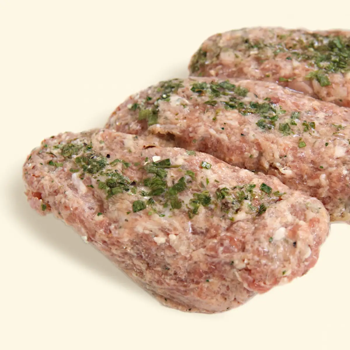 Состав: Говядина, свинина, вода, лук репчатый, соевый белок, соль, яичный порошок, декстроза, чеснок, петрушка, пряности.