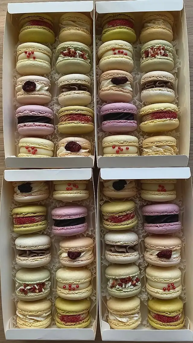 Макарон — пирожное с различными начинками на основе шоколада, сливок, творожного сыра, ягод и фруктов. Срок хранения в холодильнике — 72 часа. Без ягодной начинки — до 7 дней.