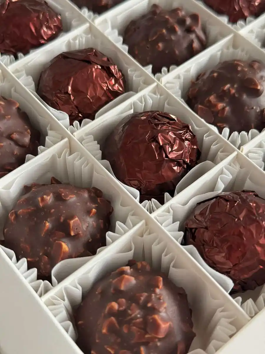 Состав: миндаль, аллюлоза, вода. Шоколад: какао тертое, какао масло, миндаль обжаренный рубленый, ваниль, соевый лецитин. КБЖУ на 100 г: 394 ккал Б 13,3 Ж 36 У 8,7 Коробочки могут быть на: 3, 5, 8, 9, 16 штук. 1 конфета примерно 25 гр.