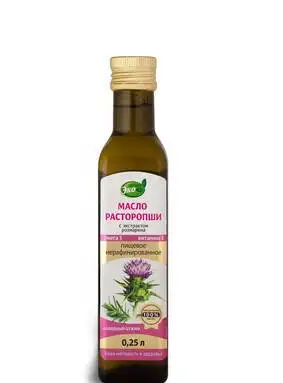 Масло расторопши с розмарином — масло пищевое нерафинированное. Изготавливается методом холодного прессования из семян расторопши пятнистой с добавлением растительной добавки для стабилизации масла — экстракта розмарина. Масло расторопши — натуральный продукт, содержащий незаменимые полиненасыщенные жирные кислоты, токоферолы и другие биологичеки активные вещества, присущие плодам расторопши.