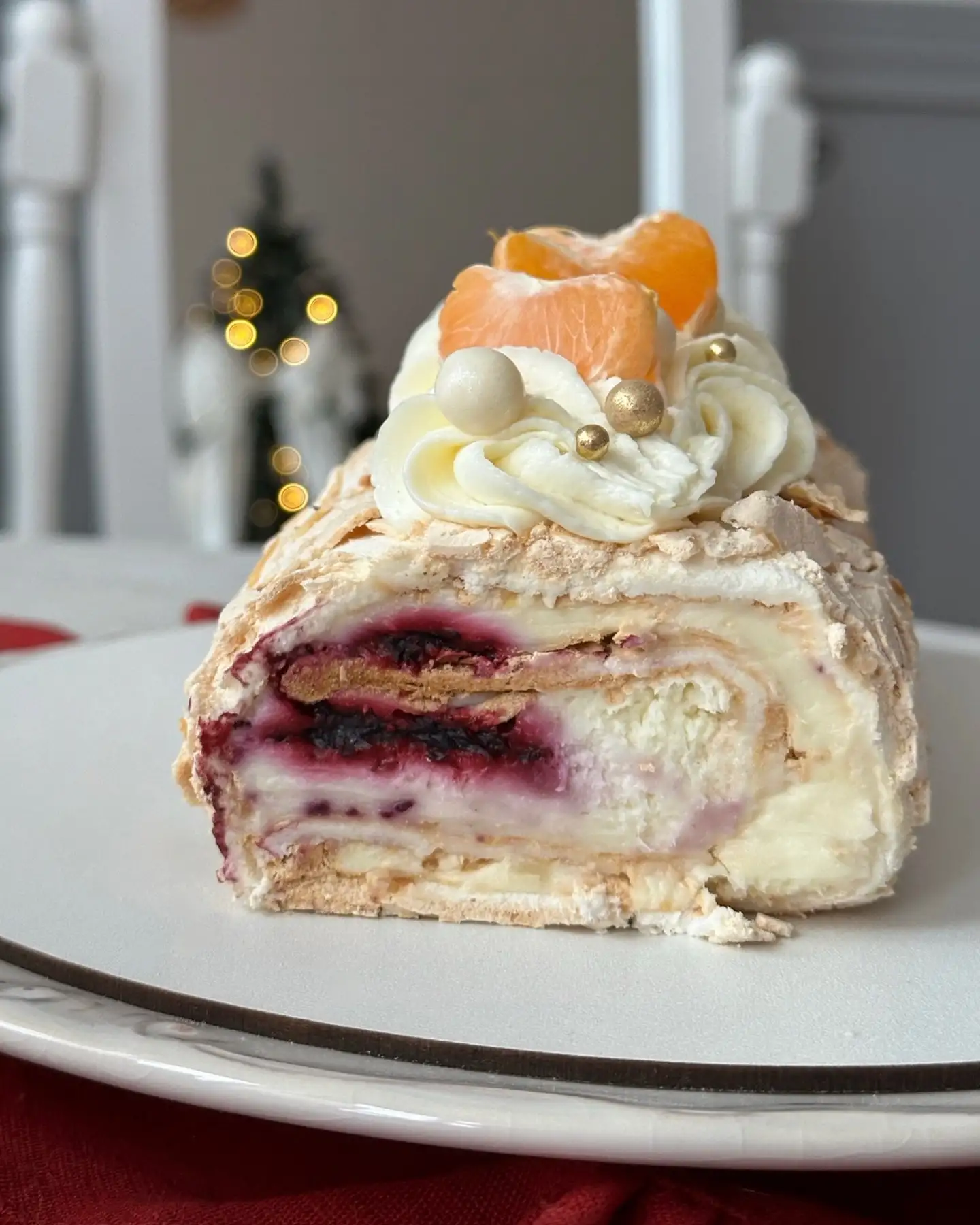 Меренговый рулет — это очень нежный десерт, в котором соблюдается идеальный баланс сладкой меренги (взбитых белков с сахаром), воздушного крема на основе крем чиза,а легкую нотку кислинки придает смородиновое куле