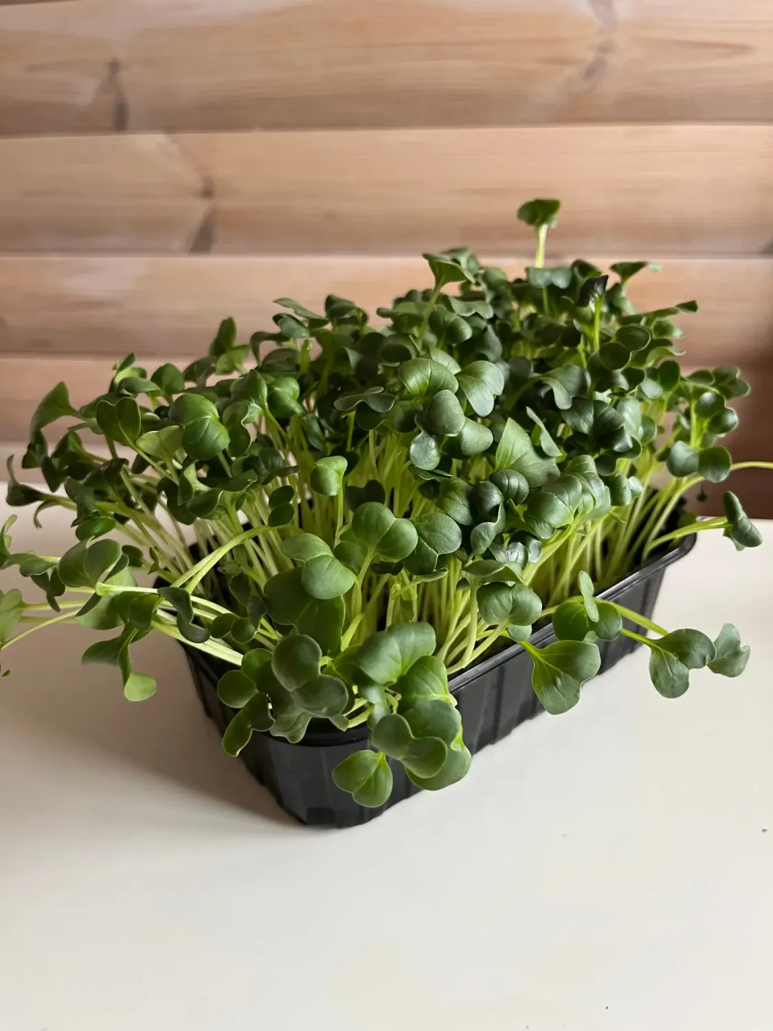 Растущая микрозелень - лоток (10*17см). Имеет нежный и свежий вкус редиса с легкой острой ноткой, добавляя блюдам неповторимую свежесть и хрустящую текстуру.