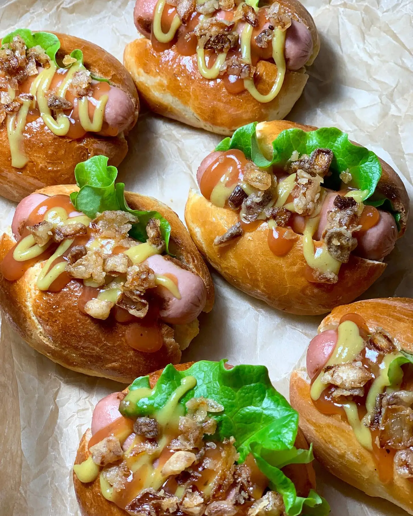 Состав: домашняя булочка с мини-сосиской, фирменным соусом, американской горчицей и луком фри.