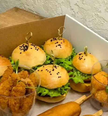 Состав: мука, молоко, фарш, помидор, сыр плавленый, салат, мариновыный огурец, кетчуп, майонез.