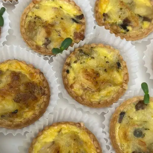 Мини-киш с курицей, грибами и луком Мини-киш с курицей и маринованным огурцом Мини-киш с ветчиной и маринованным огурцом Мини-киш с беконом, луком и грибами Заказ от 10 штучек.