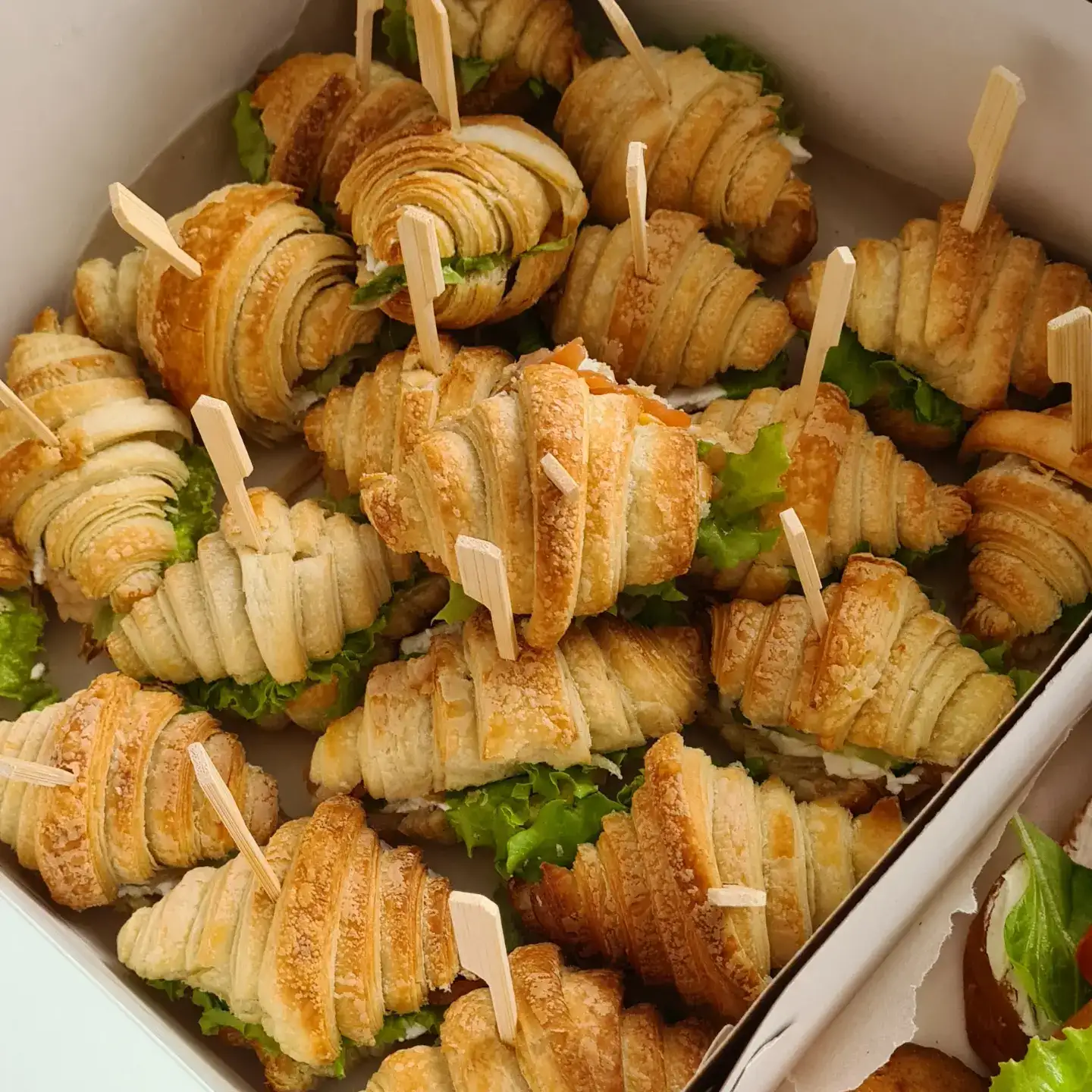 Варианты начинок: — С овощами Состав: Сложенный круассан, листья салата, сыр, огурец, томат. — С форелью Состав: Слоеный круассан, творожный сыр, форель слабосоленая, огурец, зелень. — С ветчиной Состав: Слоеный круассан, соус Цезарь, ветчина, зелень, томаты. — С копченой курицей Состав: Слоеный круассан, сливочный сыр, курица копченая, перец болгарский консервированный, зелень. — С авокадо и креветками Состав: Слоеный круассан, сливочный сыр, авокадо, креветка королевская.