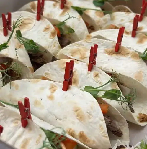 Мини-тако «Цезарь» с креветками Мини-тако с говядиной, овощами и хрустящим луком Заказ от 10 штучек.