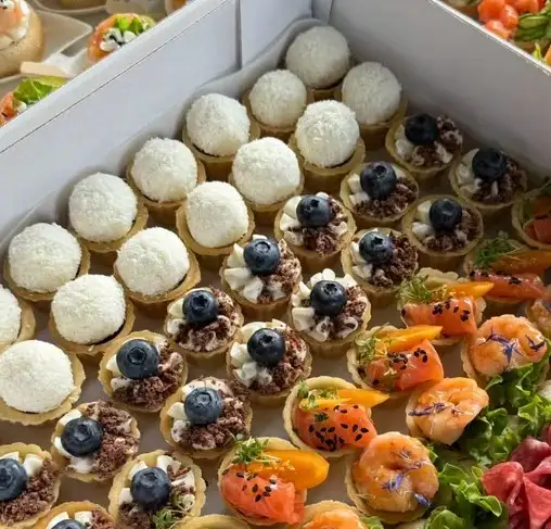 1. С кокосовым шариком и джемом, 16 шт 2. Сладкие с кремчиз и ягодой, 16 шт 3. С форелью, 16 шт 4. С креветкой, 16 шт