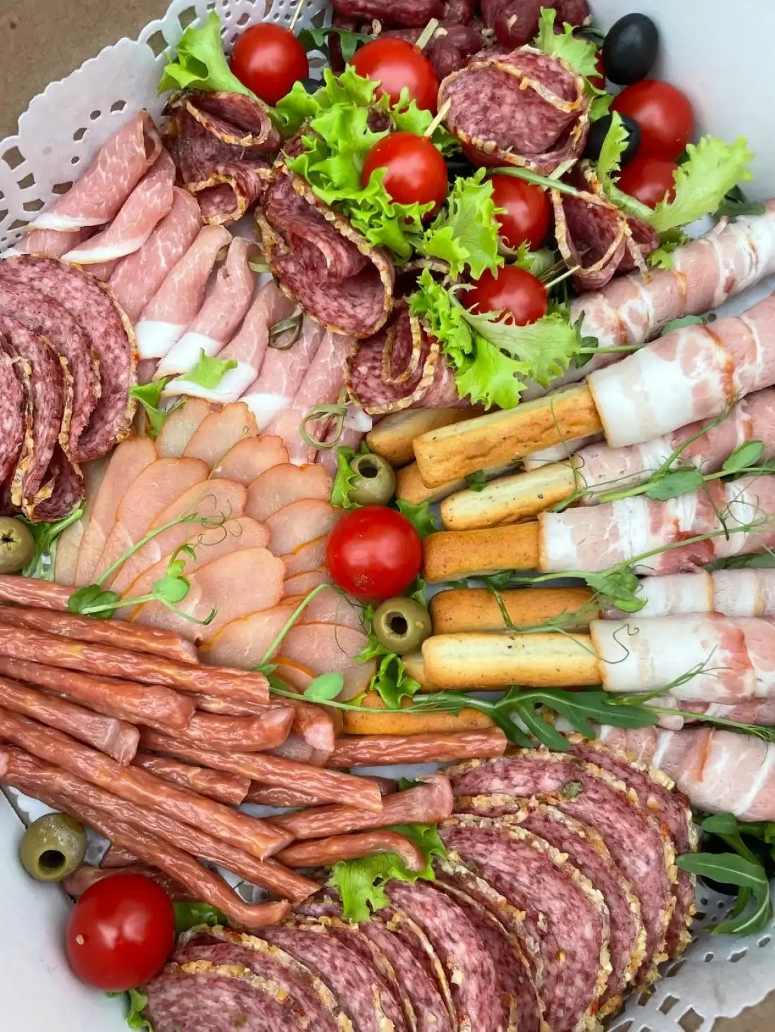 — томат черри — салат латук — оливка — маслина черная — колбаски кобандос классические — палочки хлебные — бекон премиум — колбаски кобандос мини классические — колбаса салями милано — карпаччо — полендвица свиная по-деревенски L — 97 рублей 800 гр XL — 117 рублей 1000 гр XXL — 159 рублей 1400 гр